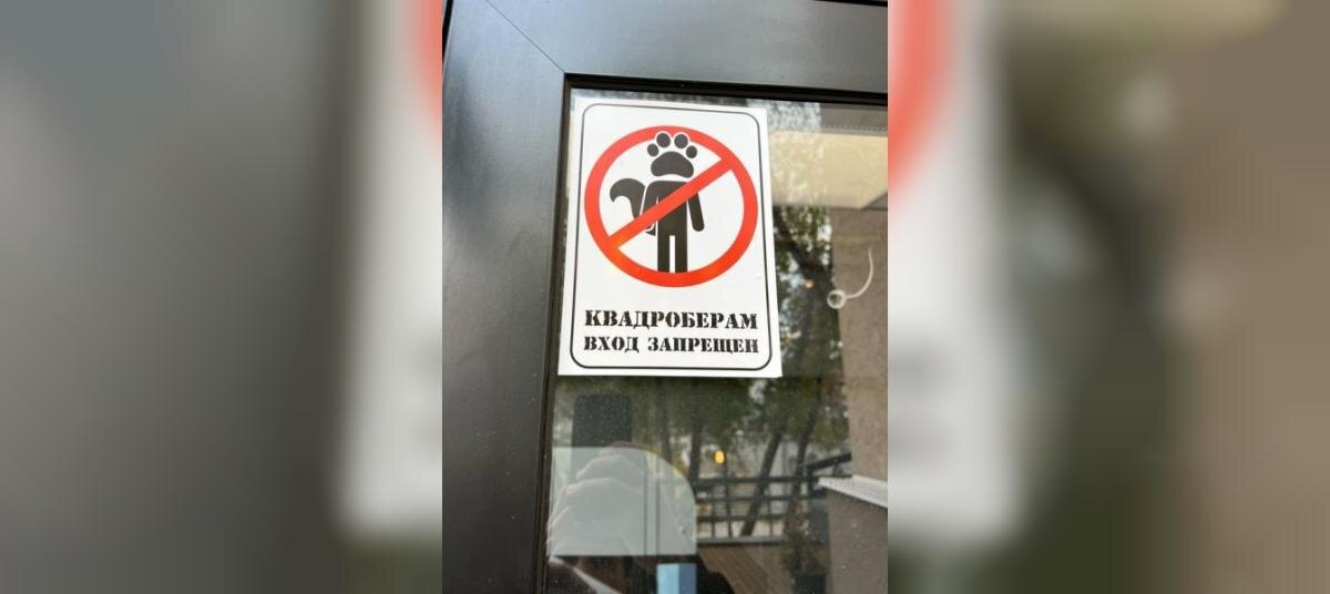 «Квадроберам вход запрещён», — написано на наклейках. Также на стикере изображена перечёркнутая фигурка человека с хвостом и лапой животного вместо головы.