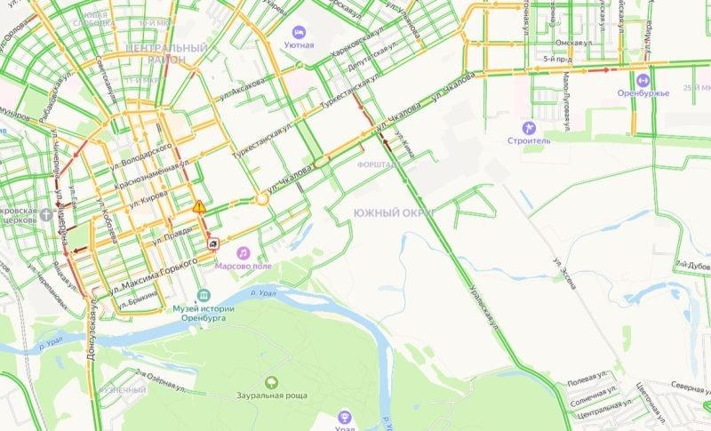 На дорогах Оренбурга вечером 25 октября — традиционные пятничные пробки. Стоят исторический центр и основные магистрали. В центральной части Оренбурга серьезный затор около автомобильного моста через Урал на улице Чичерина. Из-за ДТП стоит улица 8 Марта. Пробки вечером наблюдаются на улицах Терешковой и Березке, Шевченко и Авторемонтной. Затруднен проезд по Проспекту Победы и улице Салмышской. Загородное шоссе стоит в районе кольца из-за ДТП и большого потока автомобилей. Ближе к 23 микрорайону — свободно. Также относительно легко можно проехать и по Нежинскому шоссе. Ранее сегодня на нерегулируемом перекрестке в центре Оренбурга снова случилось ДТП. Так, днем 25 октября на улице Кирова столкнулись «Лада» и иномарка. ДТП произошло на пересечении с улицей 9 Января. Транспортные средства получили механические повреждения.