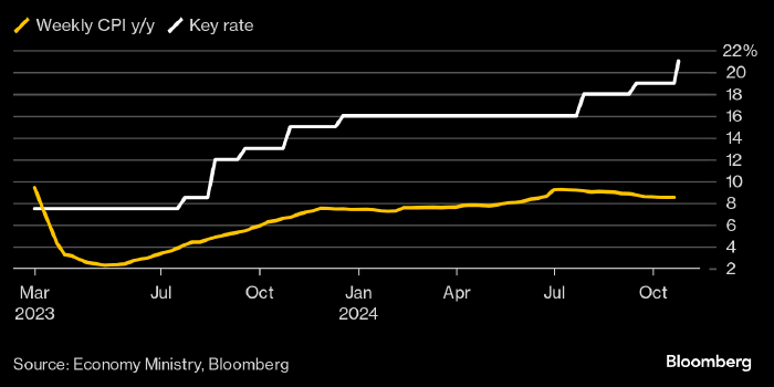 Желтым — недельная потребительская инфляция в РФ в пересчете на год, белым — ключевая ставка ЦБР. Источник: Bloomberg