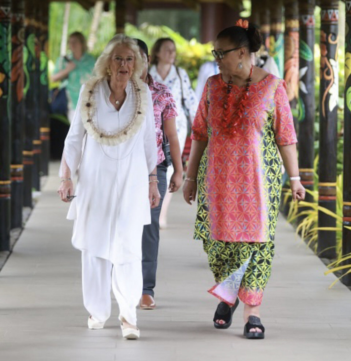 Сегодня утром на Самоа английская королева выступала на Женском Форуме. Начала она с местной легенды о том, как соревновались женщины и мужчины в укладке соломенной крыши на доме вождя. Она сказала: "Хотя они начали в одно и то же время, женщины закончили свою сторону крыши первыми, так как они трудились всю ночь, пока мужчины спали." Ссылаясь на своего мужа, короля Чарльза, она добавила: "Как у той, чей муж часто работает в ночные часы, еще долго после того, как моя голова уже на подушке! Да, я должна подчеркнуть, что есть много исключений и среди нас, женщин! Но мораль пословицы такова: женщины будут успешно выполнять любую задачу, которая должна быть выполнена, и будут усердно работать до тех пор, пока она не будет выполнена. Хочу извиниться перед мужчинами в зале,но я подумала, что мы могли бы сделать это нашим девизом сегодня." Сама Камилла выглядела отдохнувшей и спокойной.