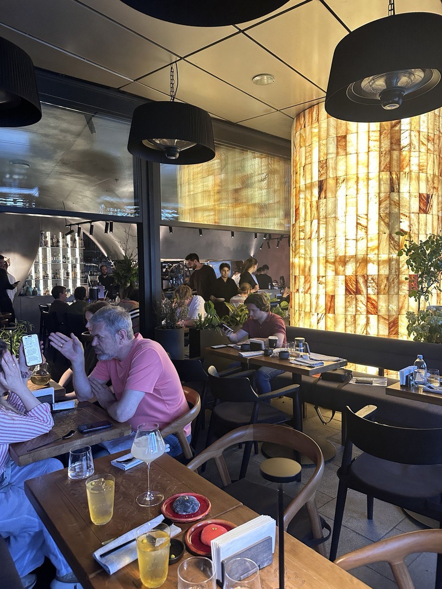 Друзья, готовьте свои вкусовые рецепторы к настоящему приключению! Недавно я заглянула в один японский ресторан, и это место покорило моё сердце! "Amber" на Цветном бульваре Небольшой зал, оформленный в серо-черной гамме, минимализм во всем — от интерьера до посуды. Но настоящая изюминка — светящаяся стена из янтарной соли, мягко освещающая пространство. В центре зала впечатляющий кастомный гриль робата, окруженный шефским столом. Здесь нет привычных плит и фритюров — только живой огонь и мастерство поваров. Кухня открытая и если интересно как готовят, то можно расположиться прямо за столешницей вокруг кухни. Есть и отдельные столики, самые интересные места рядом с панорамным окном. Летом окна полностью убираются, и ресторан превращается в открытую веранду. Посадочных мест мало, столики расположены близко друг к другу. В заведении витает аромат ладана, я приглянулась и увидела, что на полу в некоторых местах стоят зажжённые пало санто. В этот раз так увлеклась едой, что даже не пофотог
