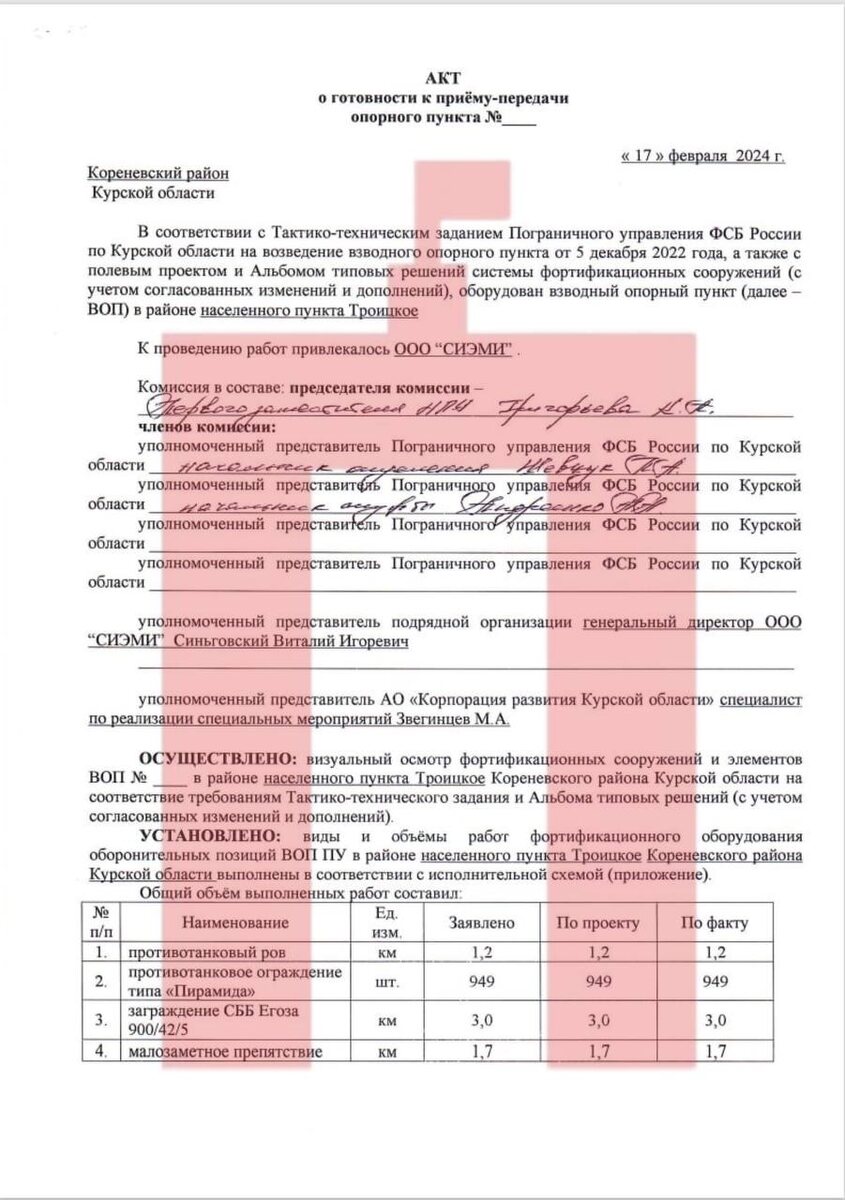«То, что были выведены деньги, а по факту ничего не построено – это слухи. Мы строили два опорных пункта как подрядчики (в Гордеевке и Троицком Кореневского района) и один опорный пункт как субподрядчики. Это были очень сложные и тяжелые проекты, они намного больше, чем у других. Они были на первой линии, практически у самой границы, 1,3 км длиной, 2,2 метра в ширину и 2,2 метра в высоту. Это практически подземный город с командирскими помещениями и помещениями для сна, системами откачки воды. Нам за наши объекты не стыдно», – заявил Максим Васильев и в подтверждении своих слов прислал редакции «Площади» акты о готовности объектов.