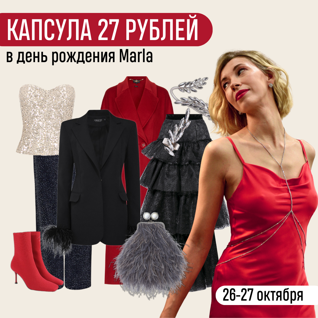 У нас ДР – у вас подарки🎁! ⠀ 27 октября 2020 три человека сняли склад и отправили первые капсулы под брендом Marla.Style ⠀ Так что сегодня и завтра, 26-27 октября, для вас любая капсула по тарифу МИНИ или ПРО за 27₽🎉 ⠀ Подберем, привезем на 24 часа и заберем все, что скажете. ⠀ ☝🏻А если вы хотя бы раз уже одевались с нами, то просто напишите нам или заполните анкету: вам подбор в подарок. 0₽ ⠀ Эти 4 года лучшее время мы провели с вами: у шкафа, у зеркала, в чатах, с платьями, которые сели и нет, жакетами, которые нравятся и «красиво, но не мое». Загадываем себе немного: встретиться здесь через год и отметить еще один день рождения! ⠀ А пока: ⠀ 🛍МИНИ: 5 вещей ⠀ 🛍🛍ПРО капсула: 8 вещей + можно обыграть ваш гардероб ⠀ 🌐Куда доставим? Через 3-4 дня после заказа. В Москву, Санкт-Петербург и их области. ⠀ 📆Когда? Примерку по акции можно провести до 31 декабря 2024. ⠀ 📏Размеры? 40-50. Если вы носите другой, напишите нам: найдем решение! ⠀ 💬Как заказать? По 🔗 здесь или в W