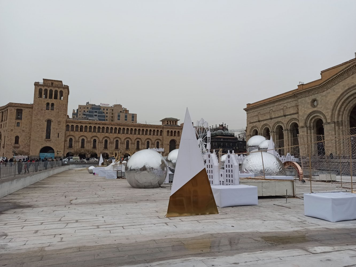 На автобусе после групповой экскурсии можно было доехать до отеля, но мы вышли на площади Республики, в советское время, нетрудно догадаться, носившей имя В. И. Ленина. Это главная площадь столицы. Она построена в 1926 году по проекту известного архитектора Александра Таманяна.