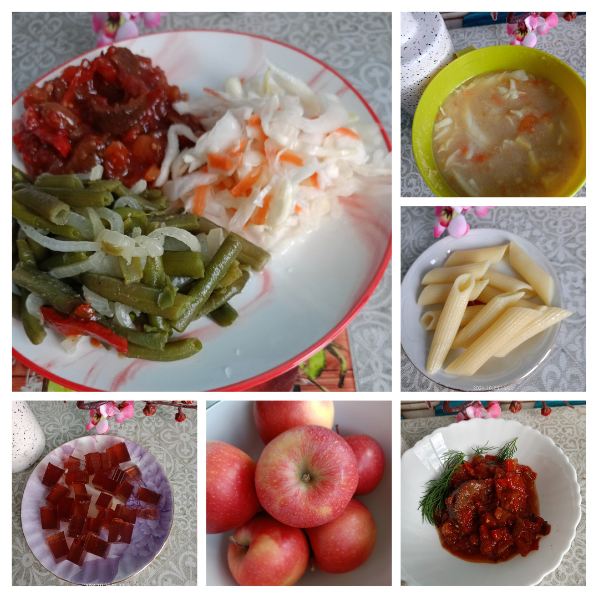 В плане питания на обед стручковая фасоль тушеная с луком, лечо с баклажанами, квашеная капуста и отварные макароны вместо хлеба. Яблочное повидло сегодня не ела, только воду пила, чуть тёплую.
