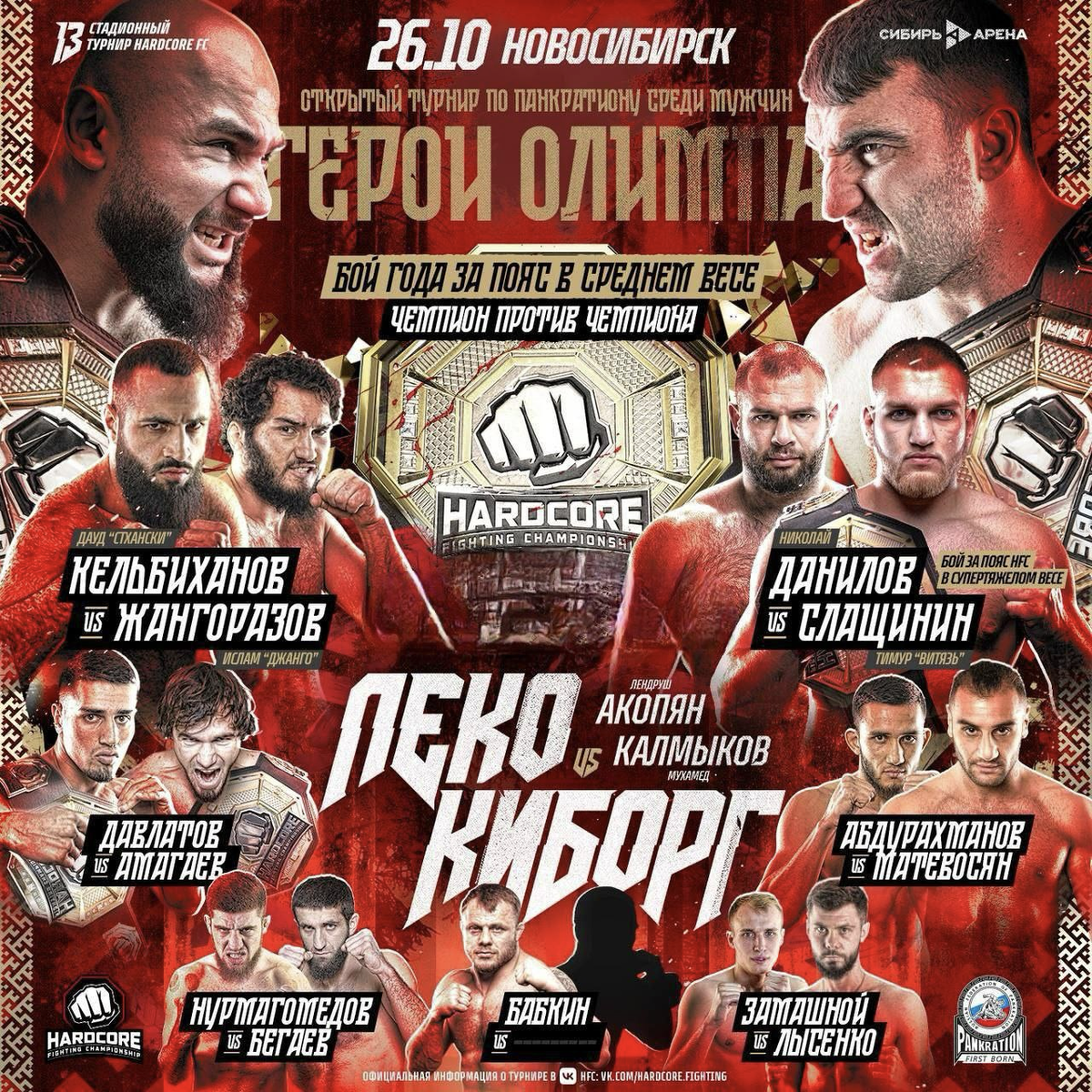 Как известно, уже в эту субботу состоится многострадальный и эпохальный турнир HARDCORE FIGHTING CHAMPIONSHIP. Турнир пройдёт в Новосибирске, начало в 18:00. Кард насчитывает 8 ярких поединков, среди которых три чемпионских боя: Лендруш «Леко» Акопян VS Мухамед «Киборг» Калмыков | Тимур «Витязь» Слащинин VS Николай Данилов и Магомед Амагаев VS Шодруз «Итальянец» Давлатов. Возвращение на кулаки Дауда Кельбиханова в бою против опытного «Джанго», крайне интересное сражение между Исой «Палачом» Бегаевым и Яхъя «Добряком» Нурмагомедовым и другие. Сегодня сделаю разбор главных боёв вечера! Начнём с главного боя, пожалуй, самого интересного боя турнира, чемпионский супербой: Калмыков — Лендруш. Бой родился спонтанно, когда Хамзат Куриев в очередной раз отказался от боя против Калмыкова, Лендруш вызвался выйти на замену. Победитель первого сезона гран-при, действующий чемпион в средней весовой категории, первый в истории обладатель титулов в двух дивизионах и единственный тройной чемпион лиги