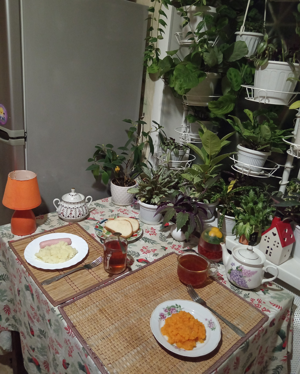 7:20. На завтрак сын заказал картофельное пюре с сосиской. Себе вчера вечером приготовила морковное пюре со сливочным маслом. Блюдо это - кладезь витамина А. Осенью часто себе готовлю.