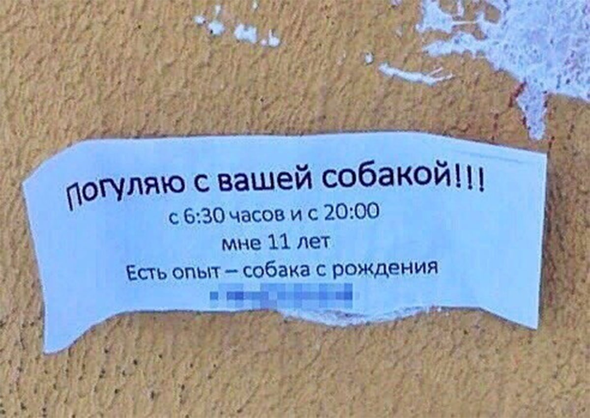 Первой зарплатой выгул собак тоже может стать, и часто так бывает, что этим занимаются подростки-школьники. Занимаются в качестве подработки, до или после уроков. И многие наверняка видели в подъездах объявления типа таких: