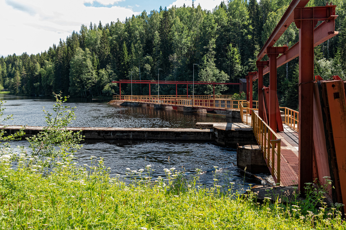 23 июня. Недалеко от ж/д моста есть ещё одно интересное место - плотина ГЭС "Хямекоски". Это самая старая действующая гидроэлектростанция, работает с 1903 года! Главная особенность этого гидроузла в том, что плотина находится достаточно далеко от ГЭС. Основная масса воды собирается в деривационный канал длиной около полукилометра и подводится к ГЭС, излишки сбрасываются через плотину в русло реки. Канал подвода воды к ГЭС, местами прорубленный в скале. Изначально плотина и канал были построены из гранитных блоков, но во время недавней реконструкции их одели в бетон. На стенке канала до сих пор видно старую каменную кладку. Плотина имеет сложную ломаную форму Река Янисйоки и густой таёжный лес по её берегам. На дальнем плане - автомобильный мост через реку. Русло Яниса, перекрытое плотиной. Хорошо видно его скальное основание. Сейчас створки плотины закрыты, практически весь объем воды уходит в канал к ГЭС. Ещё кадр с телефона, у него угол обзора пошире. Естественное русло Яниса ниже пл