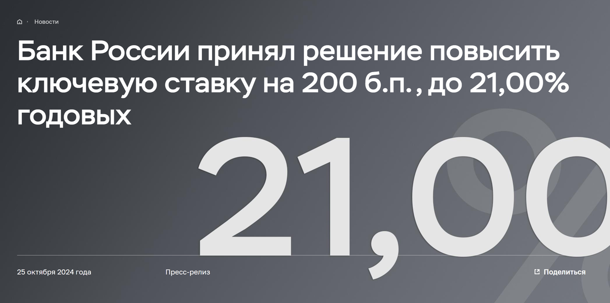 25 октября 2024 года Банк России принял решение поднять ключевую ставку до 21%. Ключевая ставка — это процент, под который Банк России даёт деньги другим банкам. Почему это важно? Как сказано в пресс-релизе: "Инфляция складывается существенно выше июльского прогноза Банка России. Продолжают увеличиваться инфляционные ожидания. Рост внутреннего спроса значительно опережает возможности расширения предложения товаров и услуг." То есть, цены растут быстрее, чем ожидалось, и люди начинают ожидать дальнейшего роста цен. Это приводит к тому, что они предпочитают тратить деньги сейчас, а не потом, что ещё больше подстёгивает рост цен. Что будет дальше с инфляцией? Банк России прогнозирует: "Годовая инфляция снизится до 4,5–5,0% в 2025 году, 4,0% в 2026 году и будет находиться на цели в дальнейшем." Это означает, что Банк России хочет снизить инфляцию до около 4% в течение следующих нескольких лет. Что происходит в экономике сейчас? В пресс-релизе также отмечено, что: "Годовая инфляция, по оцен