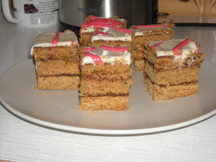 Смазать нижний и средний коржи подогретым сливовым повидлом (конфитюром). Я брала сливовый конфитюр и варенье из айвы (кусочки айвы порезала помельче). Накрыла пряник бумагой, сверху противень и поставила под гнет на 3-4 дня.