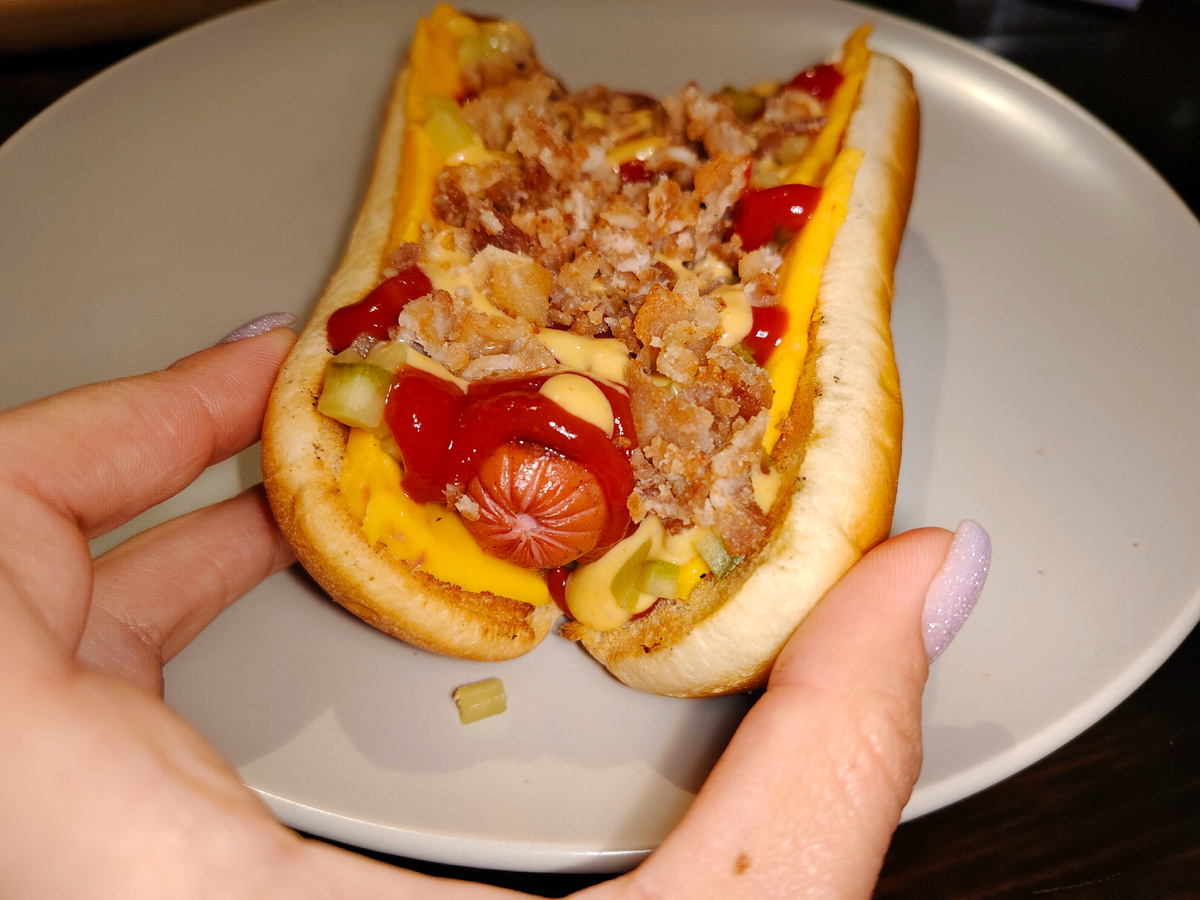 Быть может оно с голоду. Весь день работала и некогда было перекусит даже, не то, чтобы пообедать. Хотя помню. Расскажу интересную историю. Ехала в отпуск. Очень хотелось есть. На всем известной заправке купила рол. При мне его грели, а микроволновке минут 5 точно. В пути я начала его есть. А он даже не разморозился. Я погрызла это лед. И на солнышке пыталась подогреть, но не вышло. Есть хотела и ела. С голоду и он был вкусный. А вот хот-доги вкусные я ела. Но не бывает вкуснее то, что ты приготовил сам. Сейчас поделюсь с вами рецептом, на случай если захотите попробовать. Ингредиенты: - булочка для хот-дога; - сосиска; - бекон; - соленый огурец; - плавленый острый сыр; - горчица; - томатный кетчуп. Берём значит бекон и обжариваем до золотистой корочки на сковороде. Мелко режем. На углях от костра тостим булочку с двух сторон. Поджариваем на углях от костра сосиску. Нарезаем мелкими кубиками соленый огурец. Теперь начинаем собирать наш хот-дог. На булочку кладём сыр. Далее соси