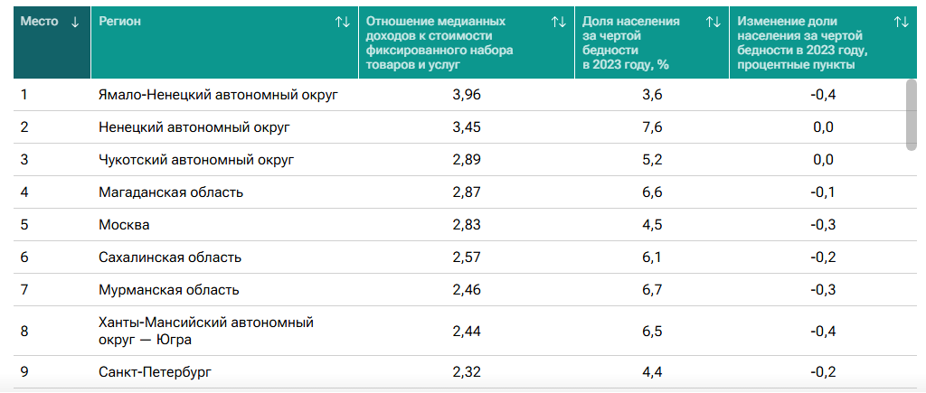 Цифра в таблице: отношение медианных доходов к стоимости фиксированного набора товаров и услуг.
