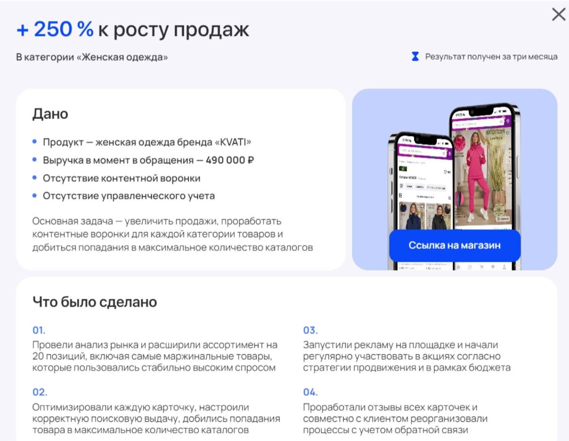 К примеру, у SellerCenter был такой кейс, где нужно было продвинуть магазин «САХАРА.НЕТ». Мы провели глубокий анализ конкурентов, и выяснили какие товары наиболее востребованы. На основе этой информации он скорректировал свой ассортимент, добавив недостающие позиции и улучшив условия доставки. В результате, его магазин увеличил стоимость товара на 30-40%.