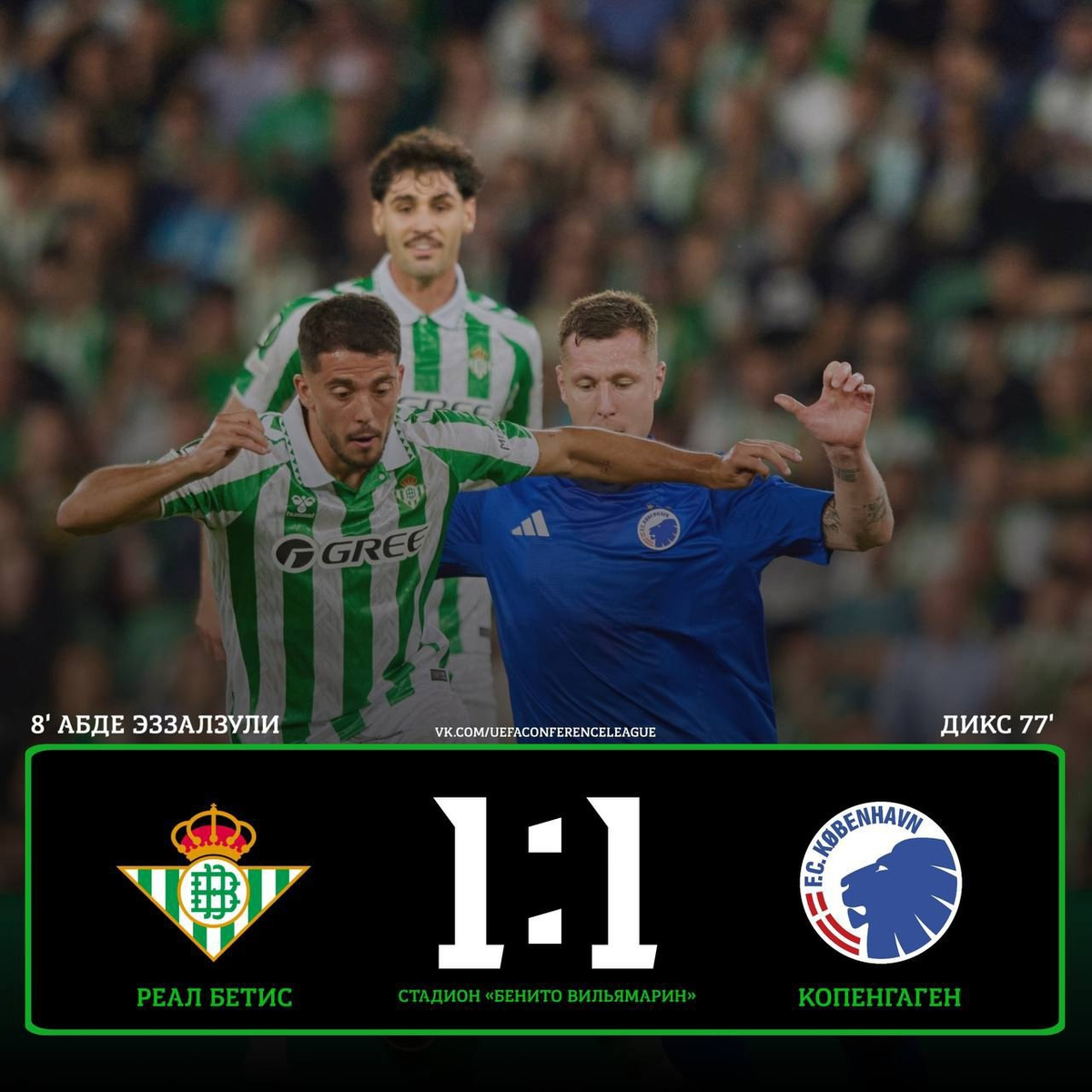 Подопечные Мануэля Пеллегрини должны были как-то ответить на поражение в первом матче Лиги Конференций против "Легии". Матч с "Копенгагеном" выглядел даже более сложным испытанием, впрочем, они не повторили ошибок прошлого, хотя и не доминировали на поле. Дальним ударом в первом тайме счет открыл Абде Эззалзули. Гол точно не был наработанным, ведь это просто мастерство отдельного исполнителя. Это позволило хозяевам чувствовать себя достаточно комфортно. Как было сказано ранее, Бетис не доминировал на поле