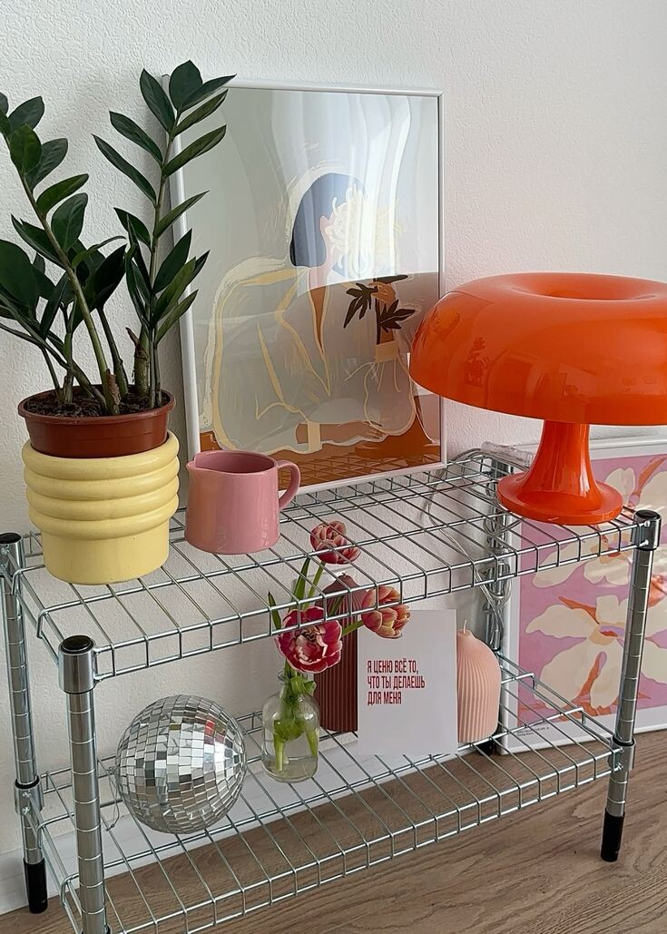 Такой уголок будет хорошо смотреться в гостиной или спальной комнате и отлично скрасит минималистичный интерьер! Металлический стеллаж Оранжевая лампа-гриб Диско-шар Похожее желтое кашпо Светло-розовая и бордовая свечи Открытка "Я ценю все то, что ты делаешь для меня"