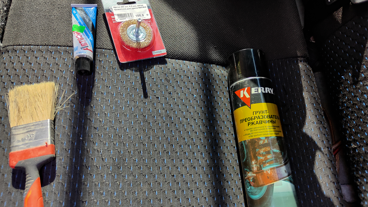 В итоге всё-таки решил немного разобрать машину и посмотреть, что под ковролином происходит. Выяснилось, что всё не так страшно, как показалось на первый взгляд. Шумка была просто мокрая. Сначала я подумал, что, возможно, вода как-то попадает внутрь, но потом почувствовал запах антифриза. Я предположил, что это антифриз из радиатора печки, но оказалось, что это не так. Дыр нигде не было, в некоторых местах были рыжики, решил сразу всё устранить. Взял шуруповерт и щетку круглую и пошел всё зачищать, где были рыжики, а они были только впереди. После этого всё обезжирил и начал травить железо преобразователем ржавчины, на это я потратил два дня.