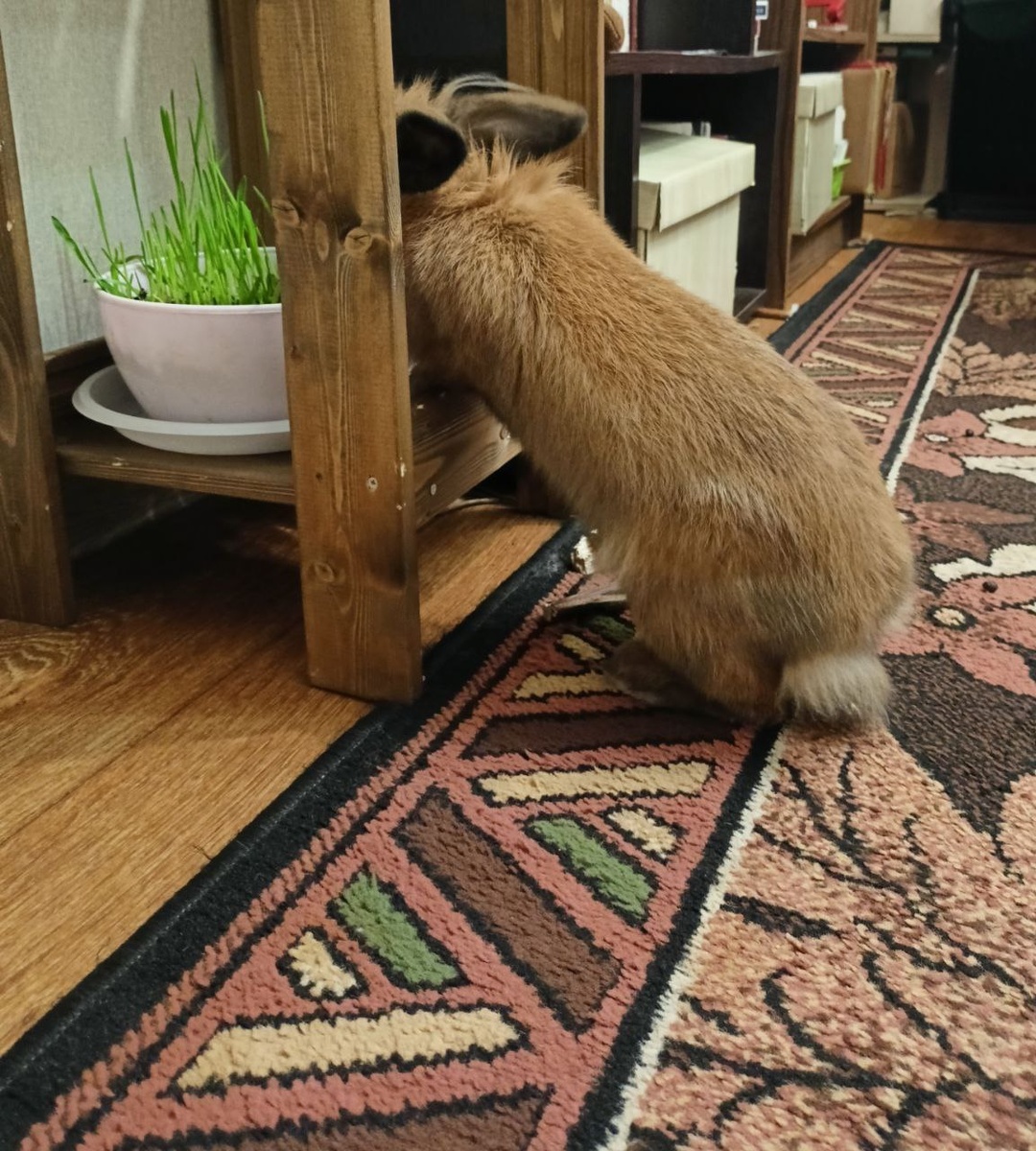 Я неоднократно говорила о том, что обеспечение ушастика свободой перемещения и безопасными игрушками значительно снижает его способность к демонтажу и разрушениям. И это правда. Ведь запертый весь день в клетке или вольере кролик при прогулке выплескивает намного больше энергии, чем тот, который имеет возможность в любой момент побегать и подвигаться. Однако, на примере Банникулы я подметила еще одну интересную особенность. Мы взяли ее крошечным крольчонком, помещавшимся в ладошке, за которой, естественно, пристально наблюдали, чтобы она не залезла куда-нибудь и т.д. Кроме того, поскольку мы ее взяли сразу после смерти Ирискина, конечно, уделяли ей повышенное внимание - ведь маленькая забавная зайка очень сильно отвлекала нас от негативных мыслей. Как выяснилось, нам с ней очень непривычно, поскольку Ирискина мы брали взрослым, как минимум, годовалым кролем, который, к тому же, когда освоился и пришел в себя после контактного зоопарка, не слишком-то и стремился ко всякого рода хулиг