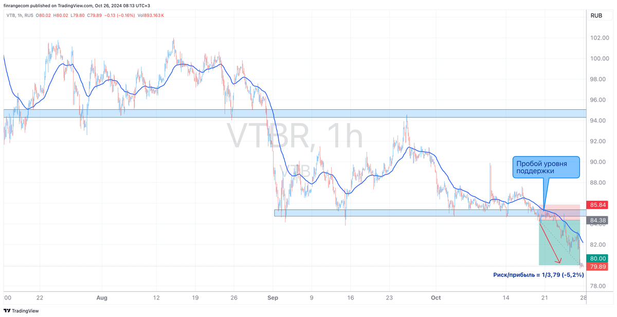 Акции ВТБ на фоне вчерашних распродаж после повышения ключевой ставки до 21% дошли до первого целевого ориентира 80 руб. Напомню, 18 октября я опубликовал идею на шорт акций ВТБ с целью 80 руб. Котировки ВТБ пробили уровень поддержки на фоне сообщения ЦБ от падении прибыли российский банков в сентябре на 23% по сравнению с августом. Цены вышли из боковика, который длился с начала сентября. Следующая цель 70 руб. – это дно по акциям, когда цены упали после объявления мобилизации. Последующее движение скорее всего будет уже на отчёте за III кв. 2024 г. по МСФО, которое запланировано 28 октября. Я бы фиксировал уже быструю прибыль по факту выхода результатов банка. Оригинал статьи смотрите в нашем Finrange Журнале. Больше об инвестициях и трейдинге вы найдете в моём телеграм-канале. С уважением, Дмитрий Баженов! Основатель сервиса по анализу акций Finrange.