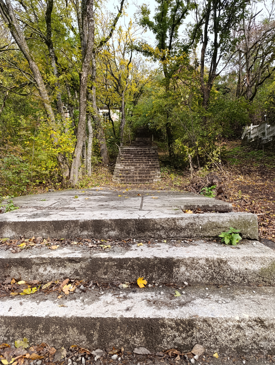Рядом с лестницей вьётся дорога, по ней наверняка можно спускаться на велосипедах. И природа! Шикарная осенняя природа вокруг!