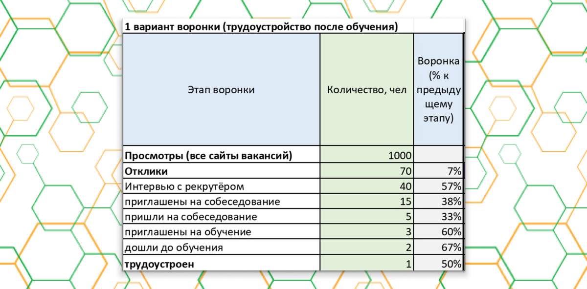 Работные сайты сейчас строят воронки сами. Можно взять данные из них. Но, если площадок для поиска операторов используется несколько, то складываем данные по всем. Если у нас кто-то из кандидатов прошел по воронке индивидуально (например, сначала трудоустроен, а потом пошел учиться или наоборот от большинства, то считаем по тому, как в принципе принято.