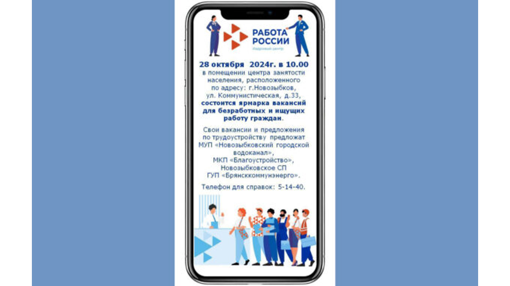 Жителей Новозыбковского округа Брянской области пригласили посетить ярмарку вакансий. Об этом рассказали в местном Центре занятости населения. Мероприятие состоится 28 октября. Начало – в 10:00. Вакансии предложат МУП «Новозыбковский городской водоканал», МКП «Благоустройство» и ГУП «Брянсккоммунэнерго». У безработных появится возможность пообщаться с представителями предприятий, задать интересующие вопросы и получить консультации специалистов. Ярмарка вакансий пройдет по адресу: Новозыбков, улица Коммунистическая дом 33. Телефон для справок 8-48343-5-14-40. 12+ В Новозыбкове состоится ярмарка вакансий