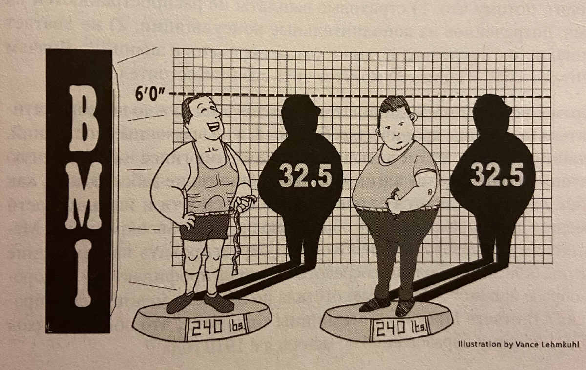 Индекс массы тела (ИМТ) - лучший прогностический фактор заболеваний, чем просто масса тела, так как учитывает еще и рост. Но ИМТ критикуют за то, что он не принимает в расчет места скопления жира. У бодибилдеров, например, очень мало жировой массы, но их ИМТ может зашкаливать из-за того, что мышцы тяжелее жира. Сегодня признается, что риски для здоровья лучше определять, исходя из того, как распределена масса тела, а не из общей цифры. Каков наихудший вариант? Абдоминальный жир - это жир, который образуется вокруг внутренних органов. Большой живот является убедительным прогностическим фактором раннего ухода из жизни. У мужчин на слайде одинаковый ИМТ, но их вес распределен по-разному. У людей с большим животом самая низкая ожидаемая продолжительность жизни. К счастью, есть более надежный метод, чем ИМТ, для оценки риска, который жировые отложения составляют для здоровья. Это соотношение окружности талии и роста. Вместо весов возьмите сантиметровую ленту. Встаньте прямо, глубоко в