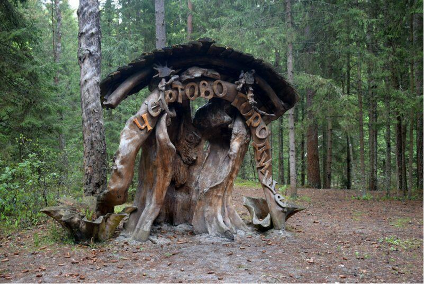 Археологические раскопки показали, что в I-V веках нашей эры здесь существовало хорошо укрепленное городище. Названием же Чертово это место обязано легенде о неудавшемся сватовстве чёрта к Любушке - дочери атамана-разбойника Кудеяра, возможно, дала современное название лесному урочищу. Чёрт, сватаясь к Любушке, получает от нее невыполнимое задание: построить за одну ночь, до первого крика петуха, дворец белокаменный, красоты доселе невиданной.