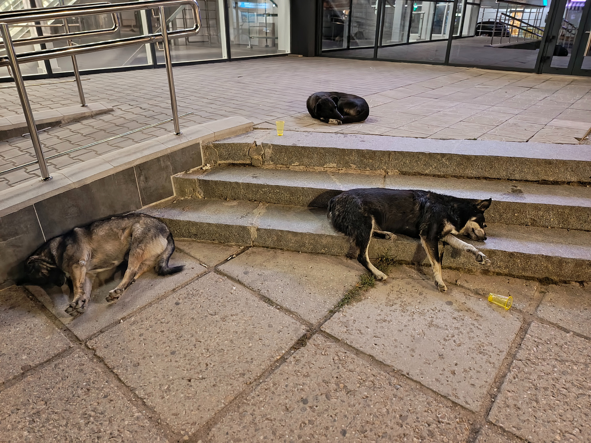 В этой статье покажу забавную компанию собак, которая обитает на улице Косарева и довольно шикарно живет. Те, кто подписан на мой канал давно, уже видели эту компанию: Тогда эти фото многих повеселили: Потом я показывала эту же компанию в другой день: Но следующие фото - это нечто: Это была летняя площадка кафе, диваны испортились, столики убрали и теперь здесь спят собаки. И спят они здесь постоянно, это фото сделано уже в другой день: А здесь еще и с банкой: И никто их не выгоняет, постоянно отдыхают на диванчиках. Собачки очень умные и забавные. И, на мой взгляд, очень хорошо устроились и шикарно живут. Я так подозреваю, что им что-то перепадает из еды в этом кафе. А когда холодно или плохая погода, они спят в магазине, около входа. Рядом много мясных магазинов и там их чем-то постоянно угощают. Вот такая забавная компания живёт в моем районе. Надеюсь, что они и вас тоже повеселили.