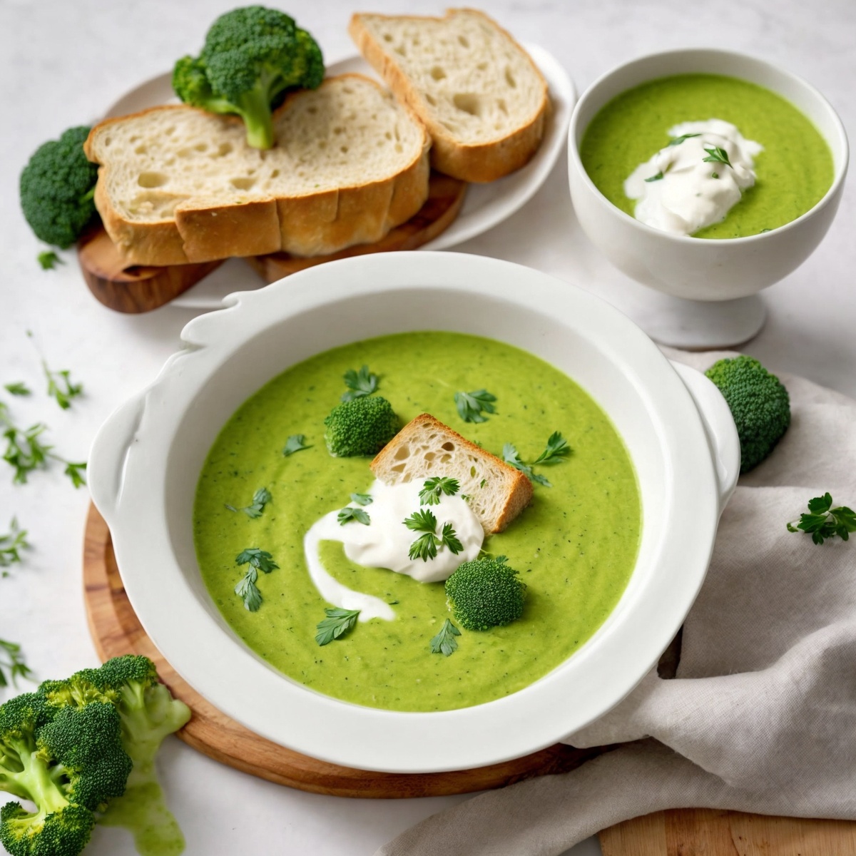 Ингредиенты: - 500 г брокколи - 1 картофелина - 1 луковица - 2 зубчика чеснока - 1 л овощного бульона - 100 мл сливок - Соль и перец по вкусу - Оливковое масло для жарки Рецепт: 1. Нарежьте лук и чеснок мелкими кубиками. В кастрюле разогрейте оливковое масло и обжарьте лук и чеснок до прозрачности. 2. Добавьте очищенный и нарезанный кубиками картофель и брокколи, залейте овощным бульоном. Доведите до кипения и варите на среднем огне 15-20 минут до мягкости овощей. 3. Снимите кастрюлю с огня и с помощью блендера измельчите суп до однородной консистенции. 4. Верните суп на огонь, добавьте сливки, соль и перец. Прогрейте, но не доводите до кипения. 5. Подавайте горячим с хрустящими гренками.