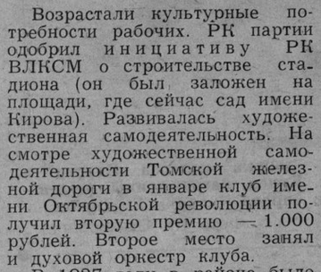 «Возрастали культурные потребности рабочих. РК партии одобрил инициативу РК ВЛКСМ о строительстве стадиона (он был заложен на площади, где сейчас сад имени Кирова). Развивалась художественная самодеятельность. На смотре художественной самодеятельности Томской железной дороги в январе клуб имени Октябрьской революции получил вторую премию - 1.000 рублей. Второе место занял и духовой оркестр клуба.