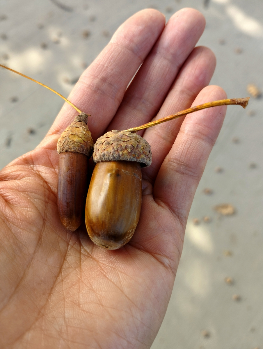 В Ташкенте издавна здо́рово прижились дубы. Осенью по всему городу на земле валяются жёлуди. Разные – толстые и тоненькие, большие и мелкие... Конечно, пройти мимо такого богатства – это не моё. Я вообще тащу в дом всё, что плохо/хорошо/ну или просто лежит))). Сохранить жёлуди целиком сложно, они сохнут, трескаются, теряют шляпки. Поэтому я наделала мухоморчиков, белых грибочков и тех же желудей из шерсти. А шляпки надела настоящие. Вчера Масяня, оказывается, стащила у меня жёлудь. И припрятала до лучших времён. Лучшие времена настали ночью, около двух. Мася достала жёлудь и начала гонять его по квартире, громко и с воодушевлением загоняя его под кровать, стулья, точными ударами лапой шлёпая им о двери и прочие поверхности. Когда я встала и попыталась жёлудь отнять, Масяня обрадовалась: в игру вступил ещё один игрок! Теперь по комнате летал жёлудь, за жёлудем Мася, а следом – разъярённая я и Сашин мат. Ну, долго ли, коротко, я тот жёлудь всё-таки изъяла и мы легли спать. Масяня отд