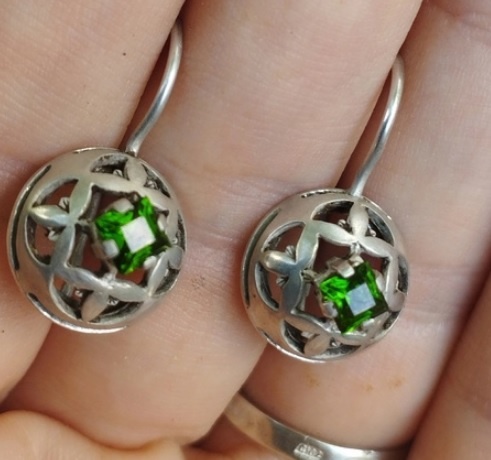 1. Хромдиопсид - это разновидность изумруда? Нет, с изумрудом он имеет мало общего, разве что зеленый цвет. Однако, в 90-е годы хромдиопсид рекламировался под торговым наименованием "якутский изумруд", но так как этот термин может вводить в заблуждение относительно вида минерала, то это название было признано некорректным и не рекомендовано к использованию. Синонимы названия - хромистый диопсид и сибирский изумруд. Хромдиопсид - это разновидность минерала диопсида, но с примесью хрома, дающего зеленую окраску. Иногда до сих пор можно встретить это многообещающее название - "якутский изумруд", хотя к изумруду и бериллу оно не имеет никакого отношения. Давайте внимательно посмотрим на вставки в украшениях, представленных в галерее. Хромдиопсид может иметь окраску, где зеленый - это основной цвет, но, в зависимости от других примесей, он может иметь желтый или голубоватый оттенки. Далее, смотрим на форму огранки. Его гранят преимущественно ступенчатой (изумрудной) огранкой, но также в в