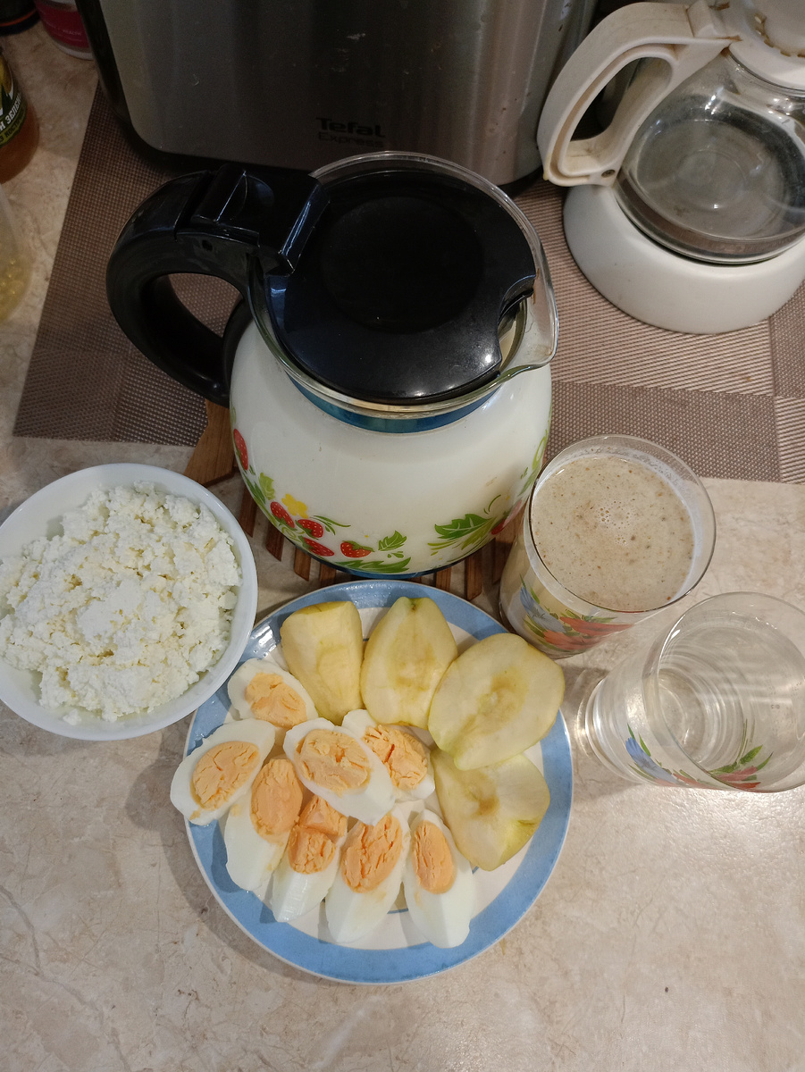 Муж позавтракал еще в начале девятого (сварил на всех яйца, их я и добавила к молокочаю).
