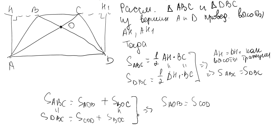 24 задание В трапеции ABCD с основаниями AD и BC диагонали пересекаются в точке O. Докажите, что площади треугольников AOB и COD равны. Все решения выполнены человеком. В случае обнаружения вычислительных ошибок, просьба отметить этот недочёт в комментариях.