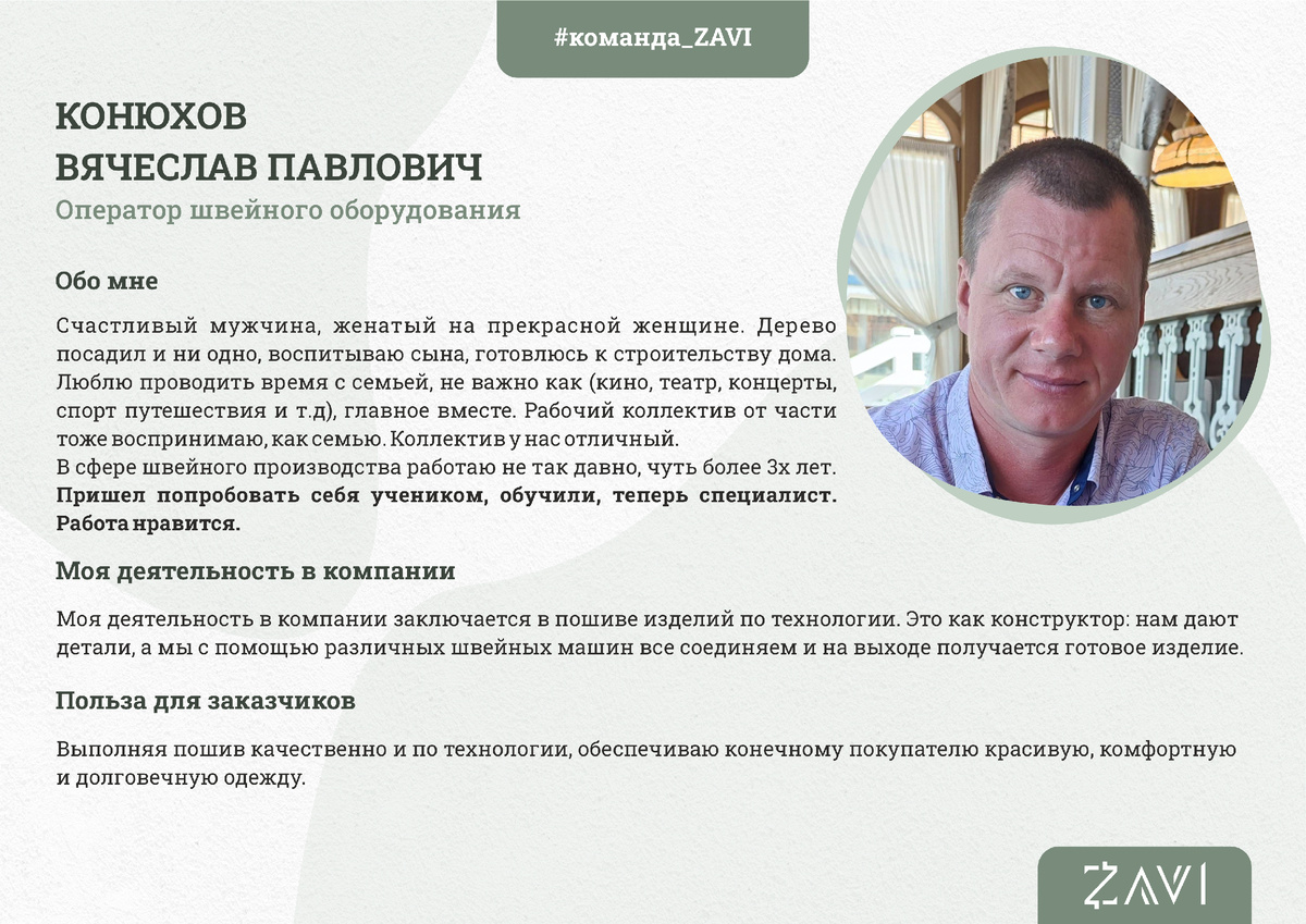✨ Продолжаем знакомство с командой ZAVI ✨ КОНЮХОВ ВЯЧЕСЛАВ ПАВЛОВИЧ Должность: Оператор швейного оборудования Пришел попробовать себя учеником, обучили, теперь специалист. Работа нравится. 🔻 Обо мне: Счастливый мужчина, женатый на прекрасной женщине. Дерево посадил и ни одно, воспитываю сына, готовлюсь к строительству дома. Люблю проводить время с семьей, не важно как (кино, театр, концерты, спорт путешествия и т.д), главное вместе. Рабочий коллектив от части тоже воспринимаю, как семью. Коллектив у нас отличный. В сфере швейного производства работаю не так давно, чуть более 3х лет. Пришел попробовать себя учеником, обучили, теперь специалист. Работа нравится. 🔻 Моя деятельность в компании: Моя деятельность в компании заключается в пошиве изделий по технологии. Это как конструктор: нам дают детали, а мы с помощью различных швейных машин все соединяем и на выходе получается готовое изделие. 🔻 Польза для клиентов: Выполняя пошив качественно и по технологии, обеспечиваю конечному покуп