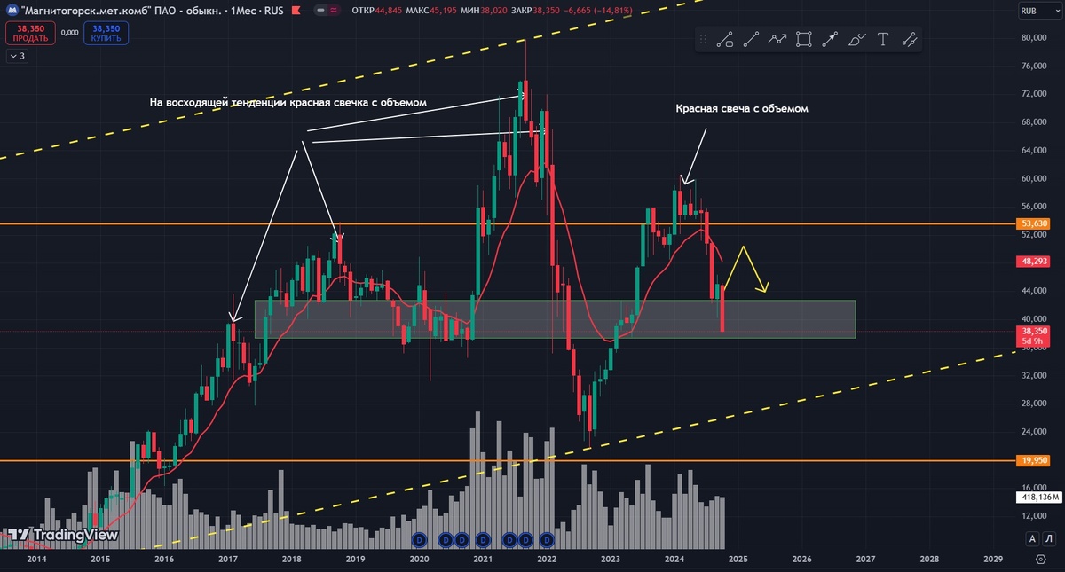 #ММК #MAGN Месяц Наши предположения были немного не верны,поскольку падающая тенденция продолжилась без отката как мы предполагали. Ссылка на предыдущий пост - https://t.me/c/1324735280/7151