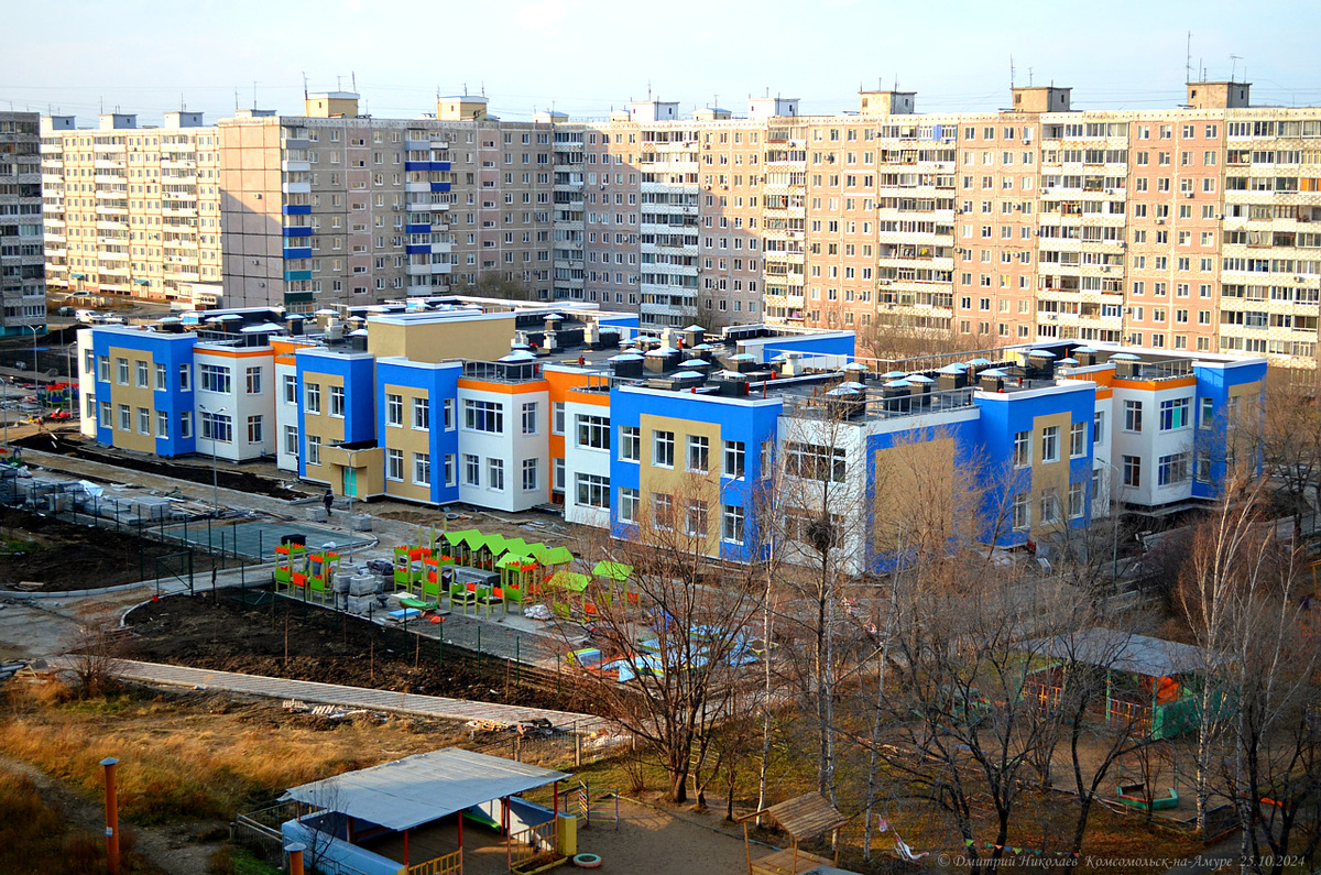 Вот так выглядит с высоты новый детский сад «Улыбка» на ул. Юбилейной в Привокзальном районе города Комсомольска-на-Амуре. Он будет самым большим в городе – 350 мест, эту эстафету он заберёт у детского сада №26, построенном ещё в СССР и рассчитанном на 330 мест. Строительство почти завершено, сейчас идёт внутренняя отделка и обустройство территории. Внешне здание выглядит красиво, современно, перспективно, надёжно. Ну, почти. Потому что во время сильного ветра на всю округу раздаётся грохот от болтающегося листа железа, плохо закреплённого на кровле. Или вовсе не закреплённого. Сдаётся нам, на новостройке такого быть явно не должно. Надеемся, все конструктивные недостатки до момента сдачи всё же будут устранены. Срок сдачи по паспорту – ноябрь 2024 г., однако после этого детский сад ещё будет лицензироваться, укомплектовываться оборудованием, мебелью, инвентарём, будут набираться кадры, а значит, окончательно откроется он, скорее всего, лишь в следующем году. Таким образом, можно сказа