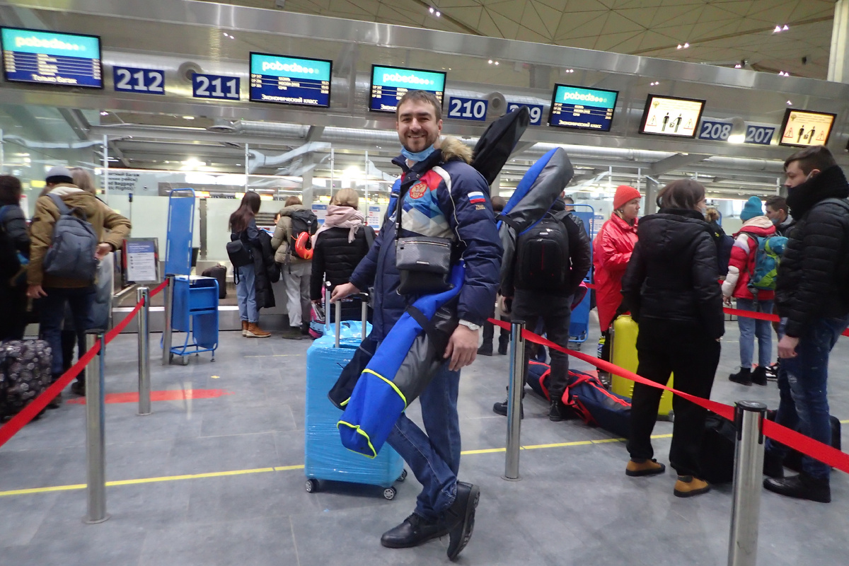 Из Санкт-Петербурга в Сочи летает огромное количество авиакомпаний, но в вечернее время, сразу после работы, нам подходил вылет только лоукост авиакомпании «Победа». Но по факту, сэкономить у нас не получилось, ведь если вы летите с багажом, да еще и со своими лыжами, цена за билет возрастает настолько, что рейс «Аэрофлота» становится более выгодным. Перелёт «Победой», если не считать катастрофического недостатка места для ног, прошёл хорошо, с мягким приземлением, и мы уже были в предвкушении хоть и короткого, но отдыха. Еще немного огорчило долгая выдача негабаритного багажа, свои лыжи мы получали около часа, но объективности ради стоит сказать, что самолёты с огромным количеством горнолыжников и сноубордистов из разных городов нашей необъятной родины приземлялись, наверное, каждые 5 минут.