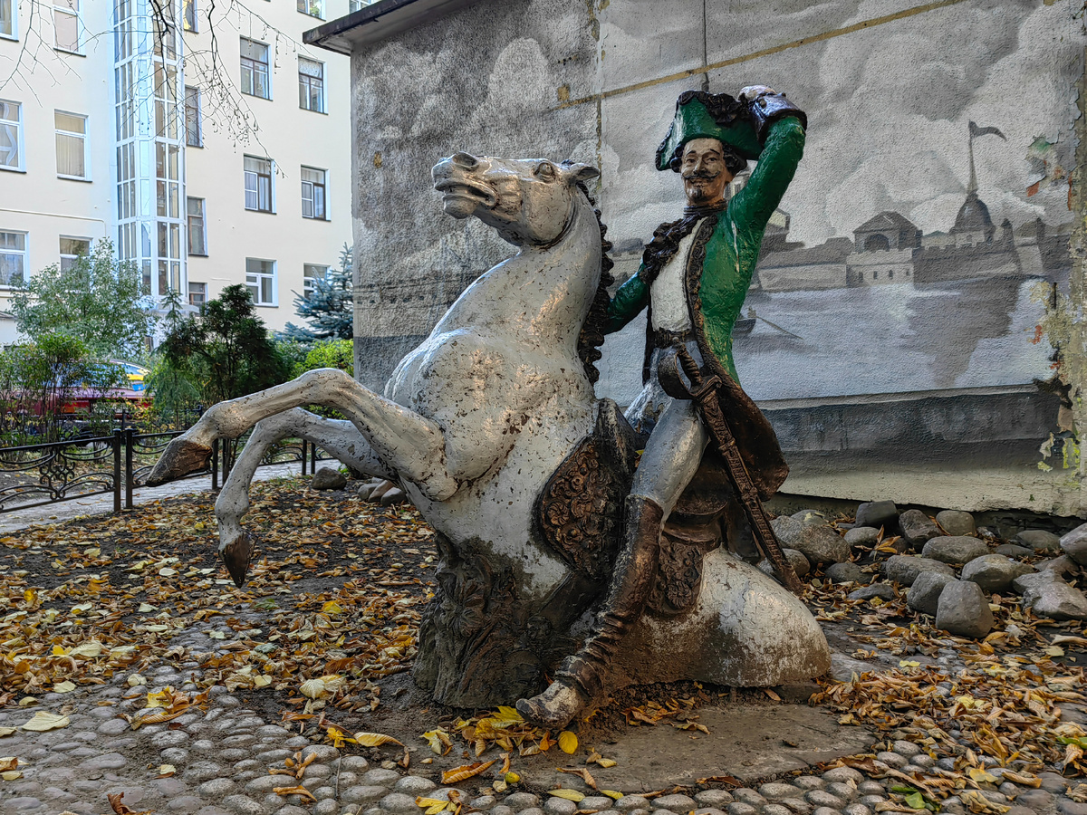 Возможно, вы никогда не были в этом любопытном дворе, который находится на Невском проспекте. Я впервые узнал о нём 21 августа 2019 года во время тематической экскурсии "Живые истории Пушкинской улицы". Речь идёт о дворике барона Мюнхгаузена. Скульптура была установлена в живописном сквере в 2014 году. Как я понимаю, она была создана в едином стиле с рисунком, который разместили на трансформаторной подстанции. Смысл композиции в том, что барон вытаскивает себя за волосы из болота. Поэтому изначально стена позади скульптуры была украшена видом именно болотистой местности. Но со временем рисунок заменили, изобразив на стене парадный вид Петербурга. Кто такой барон Мюнхгаузен? Реальный барон Мюнхгаузен – прототип знаменитого литературного героя, - в 1738 году в царствование Анны Иоанновны в возрасте 18 лет прибыл в Северную столицу, где служил в кирасирском полку. Был он гораздо моложе, чем его изобразили в старом немецком фильме (х/ф "Мюнхгаузен", реж. Й фон Баки, Германия, 1943 год).