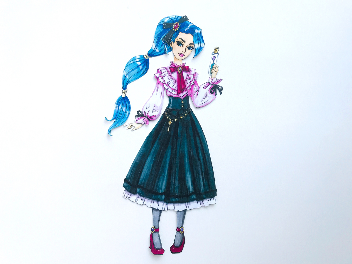 У Наталии Калашниковой есть ещё одна куколка, которая как нельзя лучше подходит для показа в Хэллоуин -- ведьмочка Флоренс. У Флоренс есть жених -- герцог Кроффордский. Он издан отдельным набором, но я подумала, что интереснее будет посмотреть эту парочку вместе: И у Флоренс, и у Герцога есть домик, у Флоренс -- лаборатория-оранжерея, а у Герцога -- царские палаты фамильный замок, а именно каминный зал и гостиная для приёма гостей. Но я опять же пока решила без интерьеров, чтобы на их фоне не "потерялись" наряды: Флоренс -- самый первый набор Наталии, и самый "богатый", и по количеству нарядов, и по количеству аксессуаров -- очень-очень много разных предметов, с которым можно придумывать разные сюжеты: У Флоренс 12 нарядов в наборе и ещё два Наталья нарисовала и опубликовала в своей группе в ВК отдельно. К сожалению, дополнительные наряды Фло оказались маловаты, вот смотрите, на этом ещё не так заметно, можно подумать, что серые части -- это подошва: Но вот у этого наряда уже прям явно