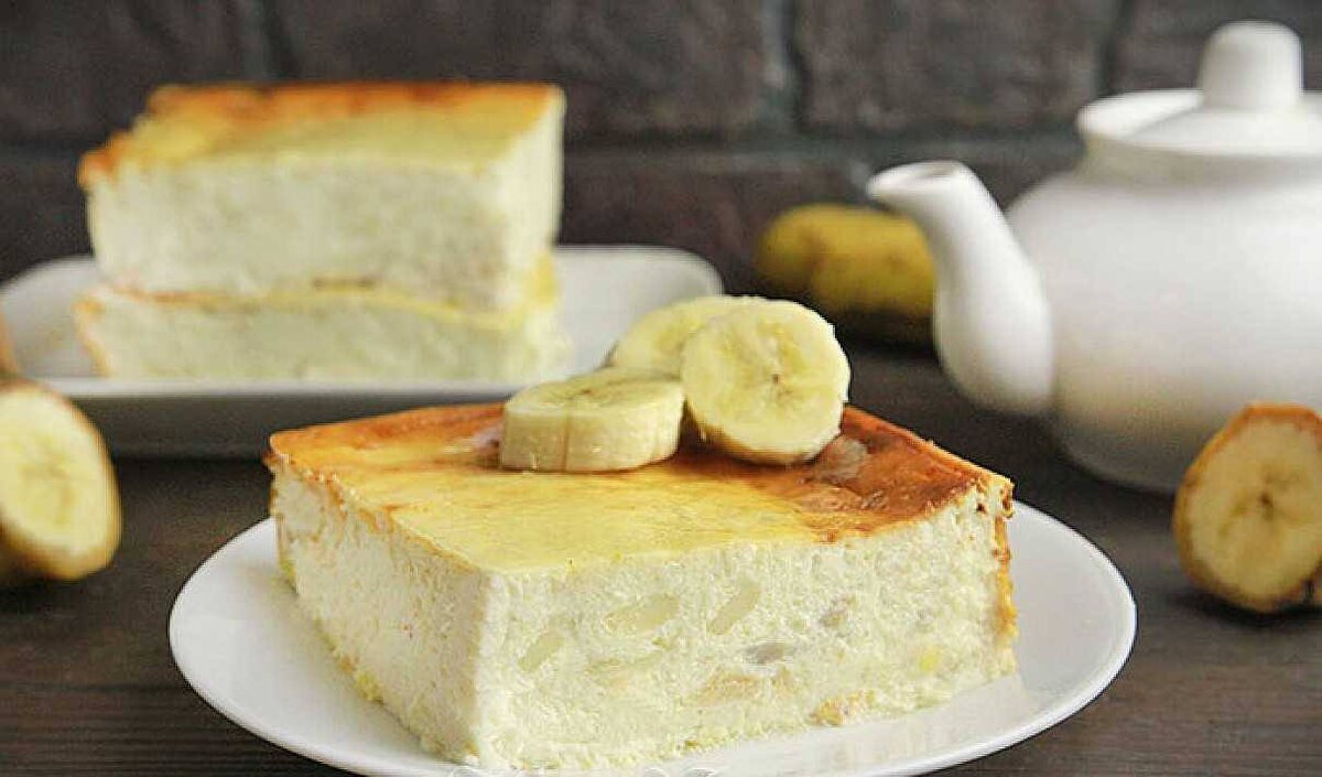 600 г творога 4 яйца 4 яблока 2 банана 1 стакан сахара 1 стакан сметаны 2 пакетика (по 10 г) ванильного сахара 6 ст. л. манной крупы Творог растереть с манной крупой. Добавить по вкусу ванильный сахар. Яйца взбить с сахаром. Добавить 1 ч.л. соды (не гасить). Вылить эту смесь в творог. Очистить 3 яблока, удалить сердцевину, нарезать мелкими кубиками. Так же нарезать очищенные бананы. Смешать фрукты с творогом. Выложить массу в форму, смазанную маргарином и посыпанную сухарями. Смазать сметаной, в которую добавлено яблоко, натертое на мелкой тёрке. Запекать в духовке 40 минут при температуре 200 гр до образования румяной корочки.