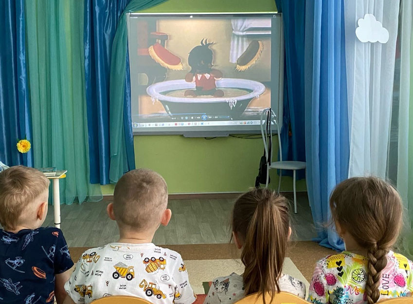 П. Давайте еще заглянем в нашего человека. Что это? (Предметы гигиены.) Как вы думаете, зачем боги решили спрятать в человека предметы гигиены? Чтобы во всем разобраться, я предлагаю вам отправиться в страну «Мойдодырию». Садитесь по-турецки на ковер-самолет. Посмотрите, впереди огромная туча. Мне страшно. Кажется, сейчас пойдет дождь. Быстрее закрывайте глаза. (Падает «Волшебный ящик».) Ой, это же гром. Как страшно. Ну все, по-моему мы прилетели, вот только вымокли. А какая удивительная страна «Мойдодырия». Это еще что? Кто забыл его здесь? Я наверное догадываюсь, А вы? (Наверняка Мойдодыр.) Давайте посмотрим, что там внутри. Здесь письмо от Мойдодыра. (Педагог читает: «Для ребят, которые хотят разгадать тайну богов».)