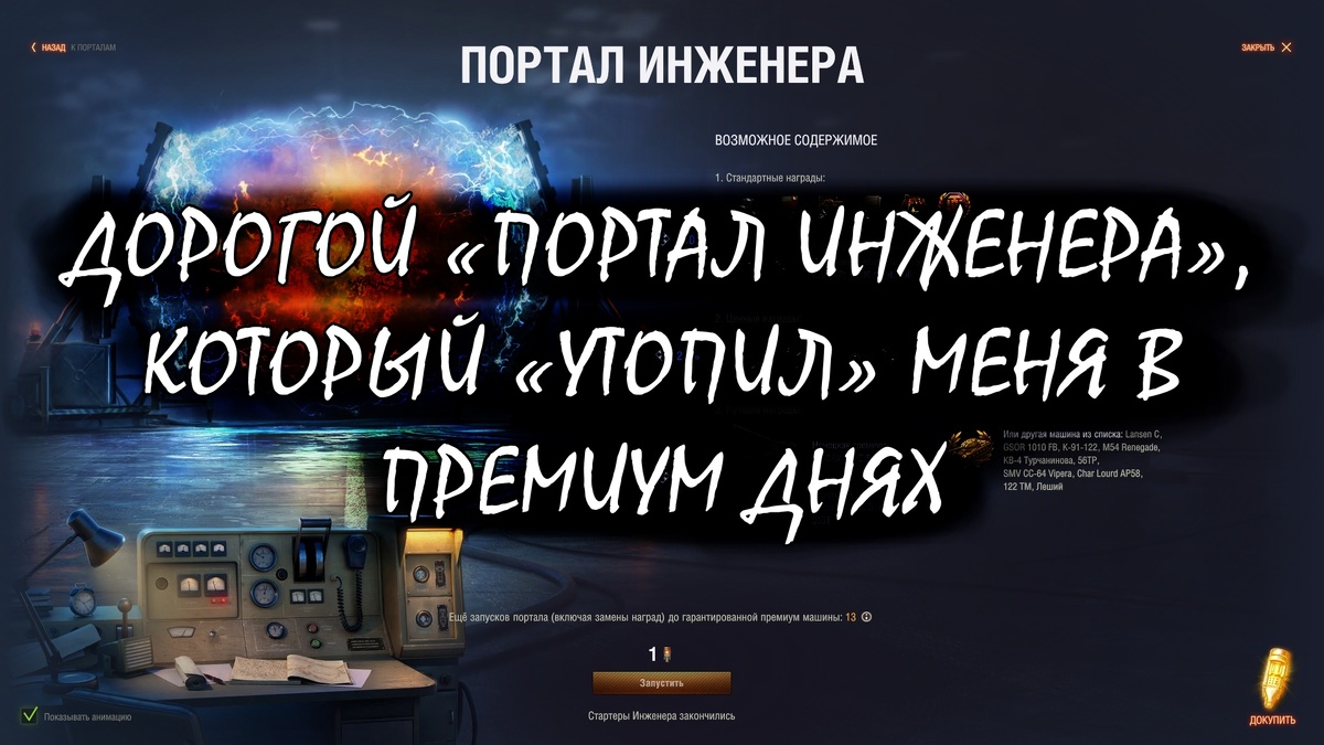 Запустил 17 раз «Портал Инженера». Сколько премиумных танков выпало?