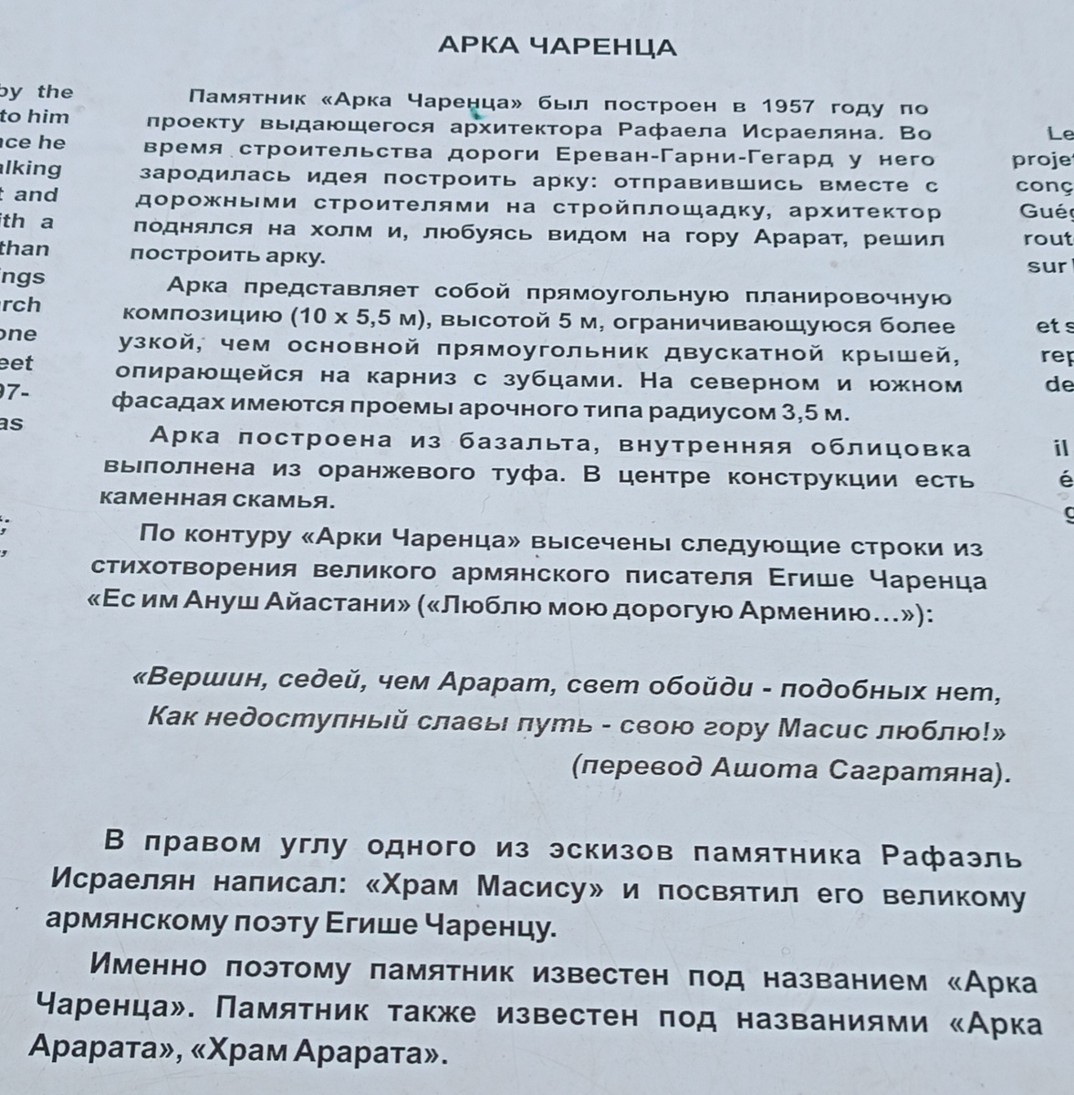 Я сказала, что Гарни- это достопримечательность, которую увидела первой из всех. Но если быть точнее, то до этого была первая остановка- "Арка Чаренца". Там видовая площадка, с которой мы мало что увидели из-за облачности. А Арка эта тоже считается некой достопримечательностью. Правда построена она в 1957 году. Совсем не древняя получается. Если интересно о ней узнать, то вот ниже на фото подробности.