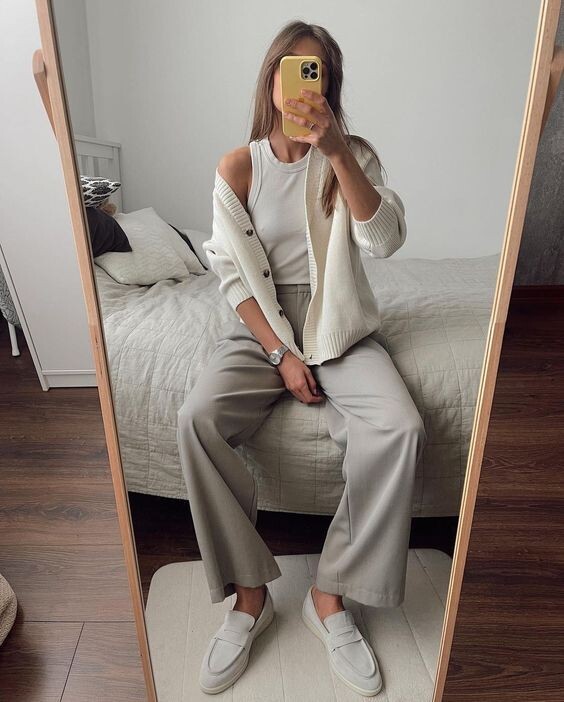 - Обувь: Лоферы, ботильоны или аккуратные кроссовки. Главное — чтобы обувь была чистой и ухоженной.