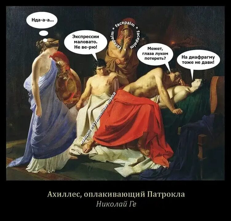 Отдал Патроклу колесницу, И предложил копьё и меч. Стрельнуло сразу в поясницу - Тяжел! Не смог поднять до плеч! Умчался, блеском кроя солнце, Во мгле растаял силуэт, Ахилл платочком лишь в оконце Патроклу помахал во след... Сначала, как и намечали - Увидев Ахиллесов шмот, Троянцы в ужасе кричали, Пустившись ужасе в разброд. Рубился, скрыв лицо забралом, И пал уж целый батальон, Удары рассыпая шквалом. Но бог, коварный Апполон, Не на Патрокла сделал ставку, И в гневе на него зело, Послал трояновскую сявку - Сыграл, мошенник, на зеро. Эвфрод трусливый, ранив сзади, Остановил победный марш. А Гектор, что сидел в засаде, Перемол почти что в фарш. Узнал Ахилл о смерти друга, В одном бельишке и без лат, Ревел как говорят, белуга, Ведь был Патрокл ему как брат... Стоял над бездыханным телом, Отдав заслуженную честь. Пора заняться снова делом. И смерть за смерть. Вот будет месть! Продолжение следует...