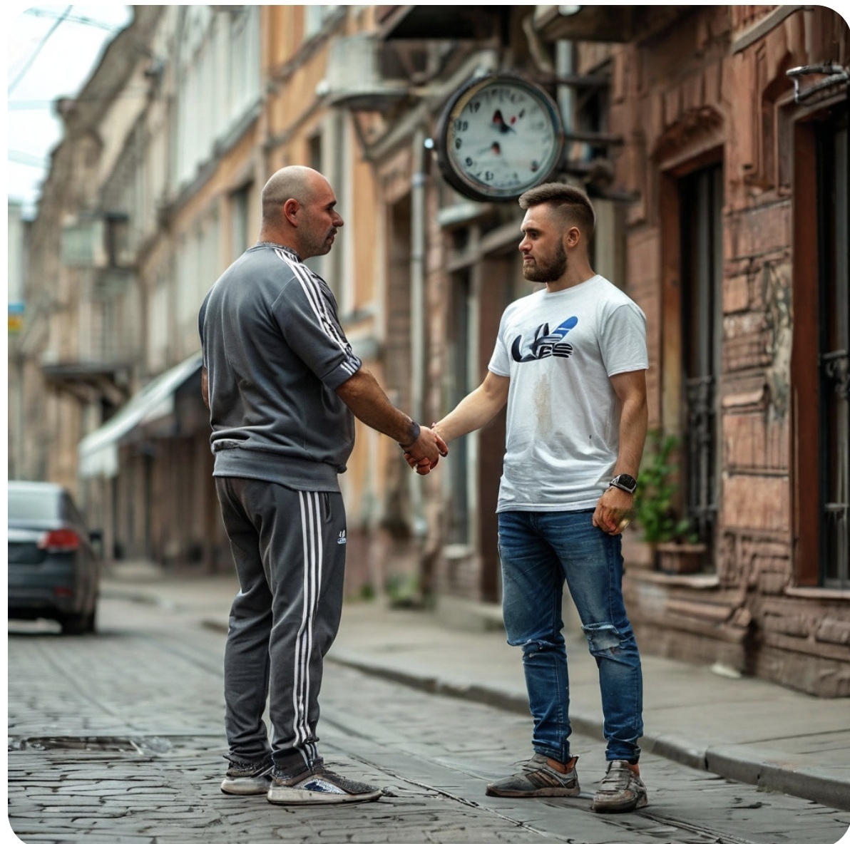 Далекий 2008 год. Мой друг детства Серега внезапно решил покорить Москву, наслушавшись что там деньги падают с неба, и незамедлительно отправился туда. Приехав в столицу и идя по улице вместе с своим знакомым Эльдаром, усиленно озираясь по сторонам и удивляясь неведомым столичным красотам, вдруг увидели, что навстречу им бодро махая рукой идёт высокий, спортивного виду лысый мужик, одетый в черный тренировочный костюм «Адидас». Поравнявшись с Серегой и Эльдаром, лысый мужик энергично протянул свою руку и громко сказал: