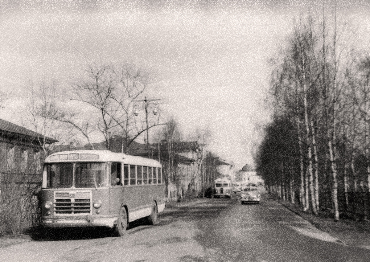 Можно заметить, что ближайший автобус, а скорее всего и следующий, стоит без пассажиров. У водителя перерыв между выездами на маршрут. Запарковался он здесь потому, что тогда движения в этом месте не было, как сейчас. Весь незначительный трафик с Октябрьского моста шёл через Кремлёвскую площадь. Ну а немного вперёд и налево в те времена ещё во всю бурлит жизнь на Колхозном рынке, память о котором сейчас сохранилась в названии места - "Старый рынок".