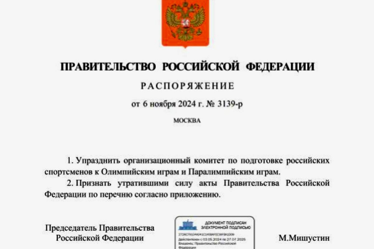 Правительство России упразднило оргкомитет по подготовке к Олимпийским играм Правительство России приняло решение об упразднении организационного комитета, ответственного за подготовку российских спортсменов к Олимпийским и Паралимпийским играм. Соответствующее распоряжение, подписанное председателем правительства Михаилом Мишустиным, было опубликовано на официальном интернет-портале правовой информации.